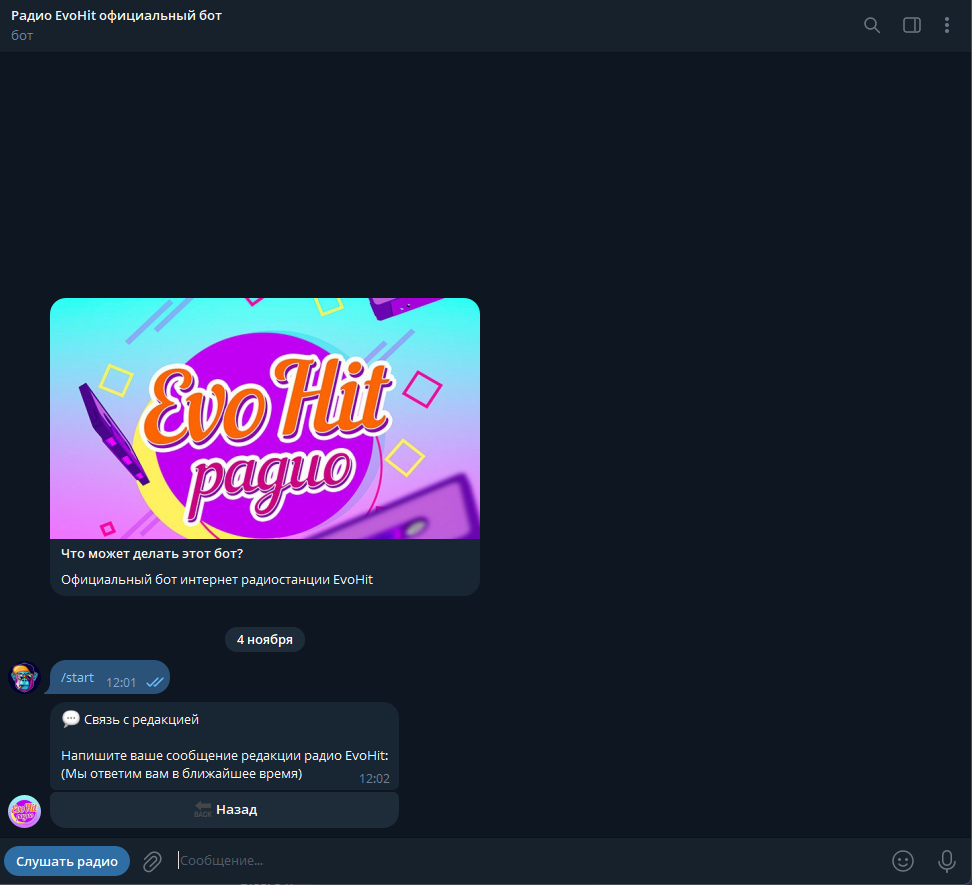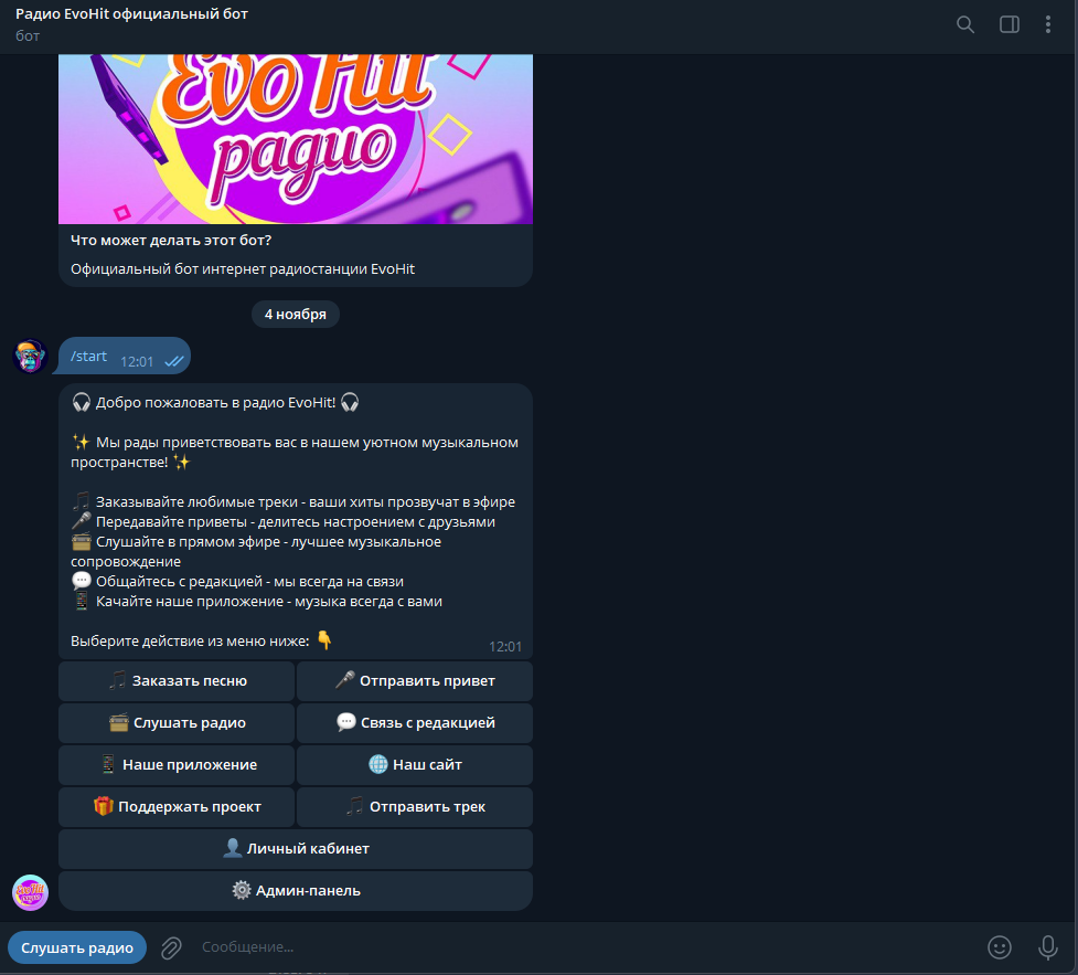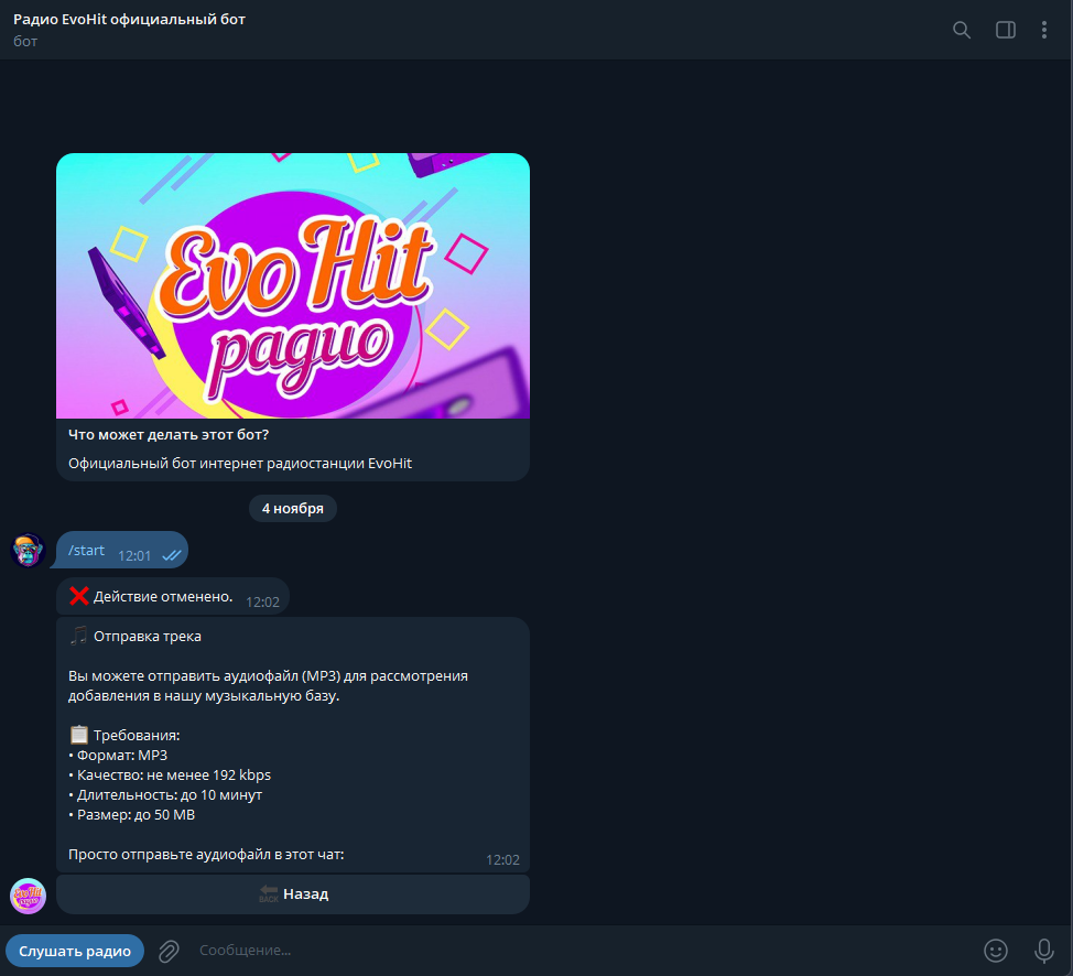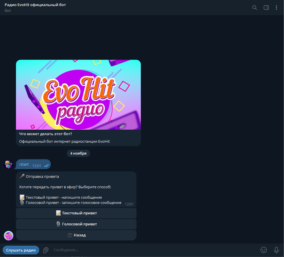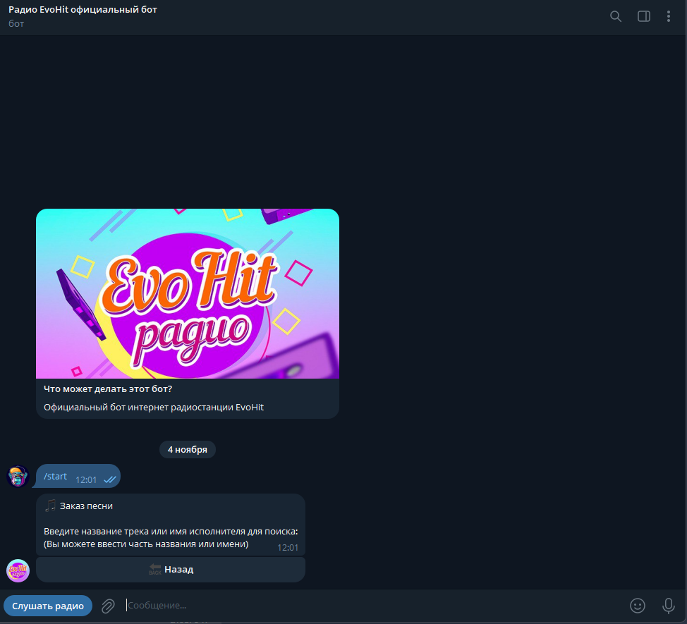 In the digital age, audience interaction is reaching a new level. We have developed a multi-functional Telegram bot for the EvoHit radio station, which has become a single window for listeners: from requesting their favorite tracks to direct communication with the editorial team. This is not just a bot, but a complex ecosystem integrated with the radio's broadcast infrastructure.